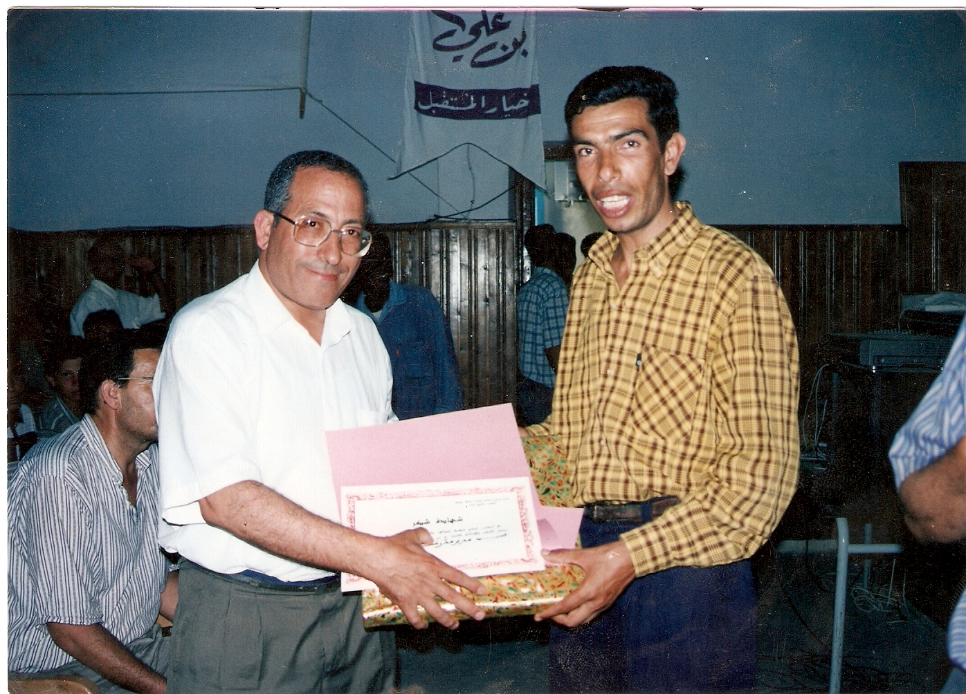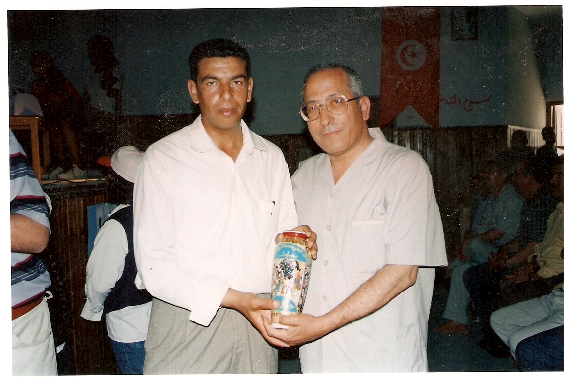 المباريات الثقافية بمناسبة فوز المدرسة بالمرتبة الثانية في الدور النهائي للمباريات الثقافية بين المدارس يظهر في الصورة السيد نصر عروم متفقد لغة فرنسية وهو يكرم السيد الجمني المومني ممثل المدرسة في هذه المباريات |