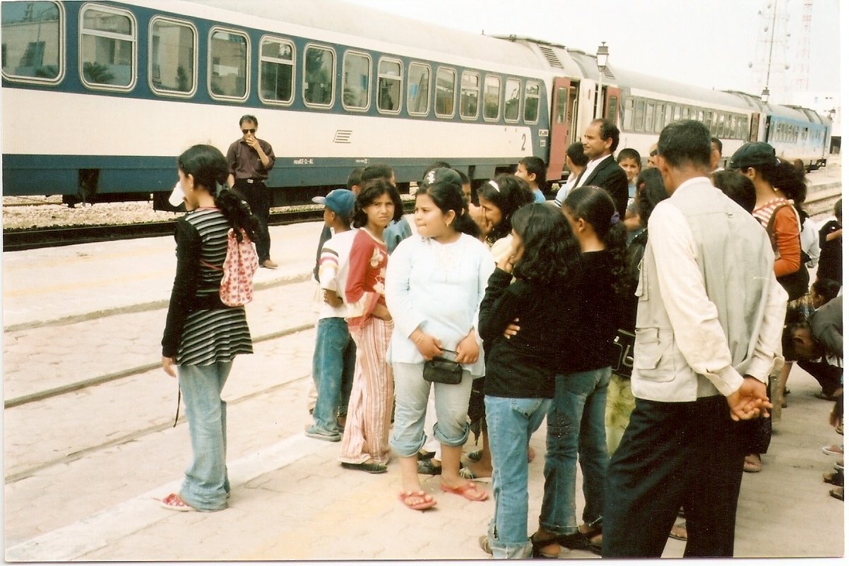 رحلة مجانية وفرتها الدولة و يظهر في الصورة السيد المدير محمد الترهوني و حارس المدرسة السيد الطاهر عروم مع التلاميذ في محطة القطار |